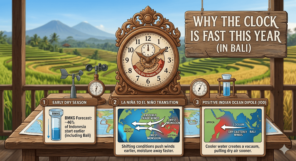 - The Transition to El Niño: We are currently moving out of a weak La Niña (which usually keeps things wet) and into a neutral-to-El Niño phase. This transition historically causes the easterly trade winds to strengthen and arrive earlier, pushing out the moisture-heavy “West Monsoon” from Java faster than usual.